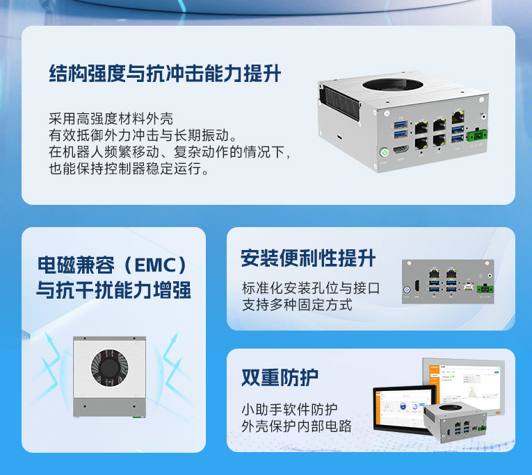 阿普奇具身智能機器人控制器的優勢,體現在一系列扎實的技術指標上。它采用輕量化設計,體積在行業內處于領先水平,能為機器人胸腔節省高達35%的寶貴空間。同時,它具備工業級可靠性:抗沖擊能力超過30G,并擁有三防設計與寬溫散熱能力,能從容應對嚴苛的工業與戶外環境。